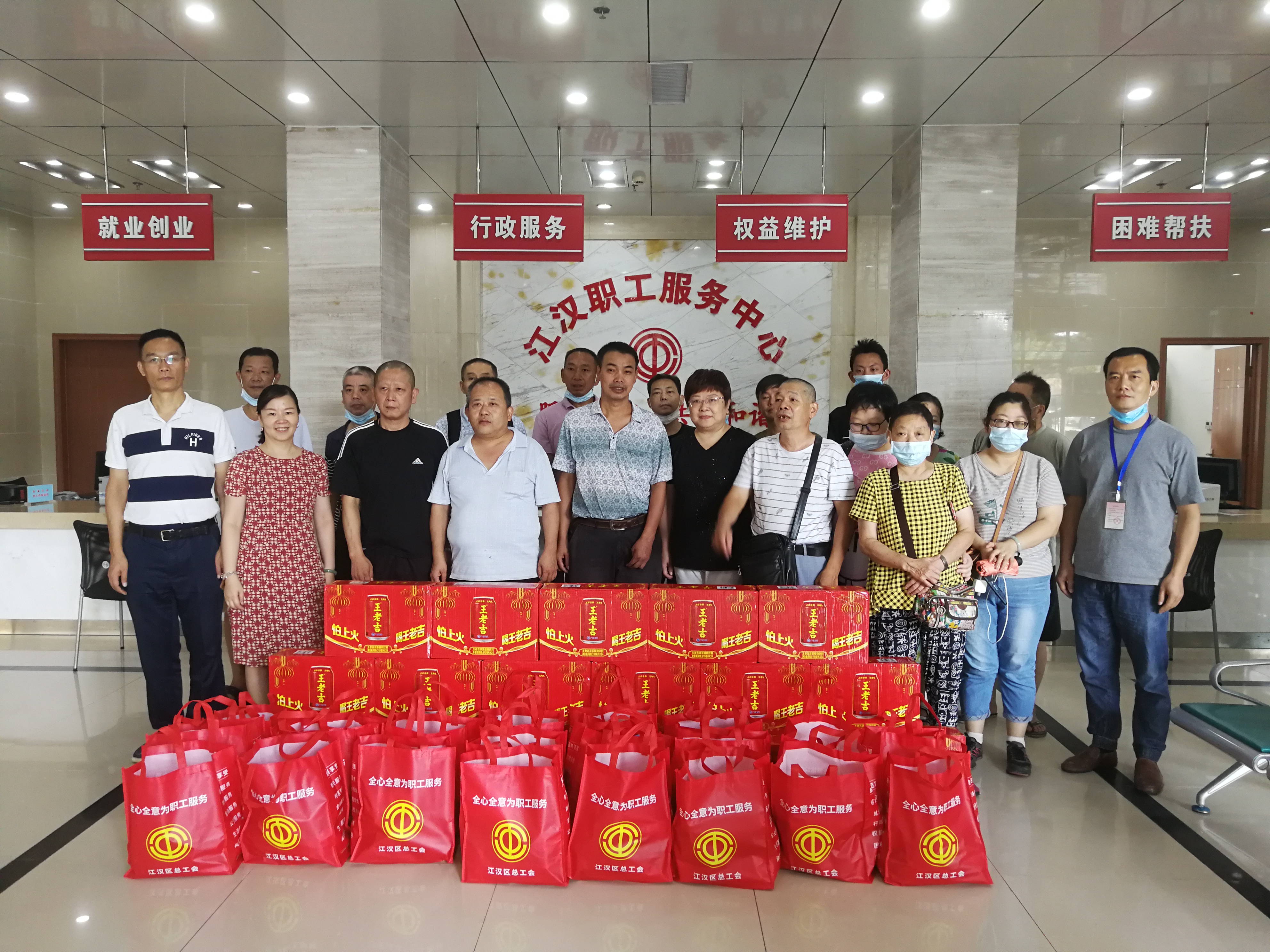 慰问组为区属12个“爱心驿站”配送矿泉水、酸梅膏、免洗手消毒液等1万余元物资,实地走访位于汉兴街、唐家墩、汉口火车站的3个爱心驿站,调研“爱心驿站”运转情况,收集“爱心驿站”现有软硬件配置在日常使用中的效果,力求贴近职工需求,解决实际困难。