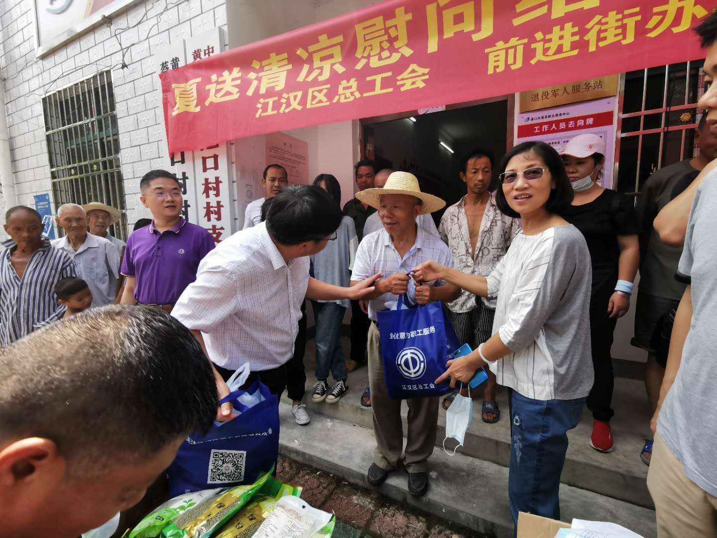 调研会后,区总工会与前进街赴村调研人员,走访慰问了村贫困户,并为他们送去绿豆、冰糖、酸梅膏、口罩、洗手液等防暑降温及防疫物资。