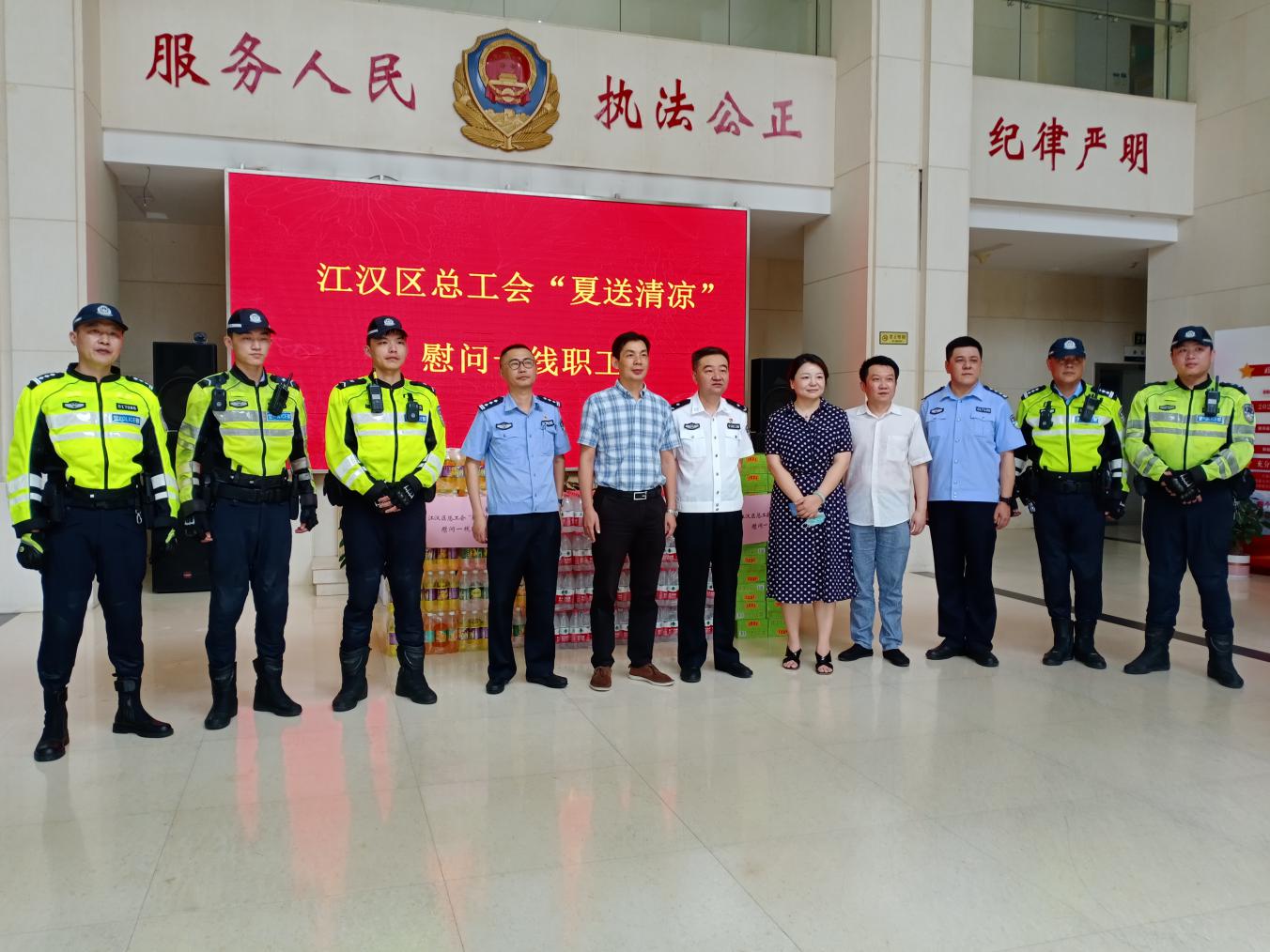 全面启动2021年度“夏送清凉”慰问一线职工活动,区委区政府领导率队分赴城市运行管理、基层服务治理、生产经营企业一线,为快递小哥、环卫工人、交通干警、建筑农民工、疫情防控专班人员等送上防暑降温用品,看望高温天气下坚守平凡岗位,为江汉经济社会发展做出贡献的一线职工。