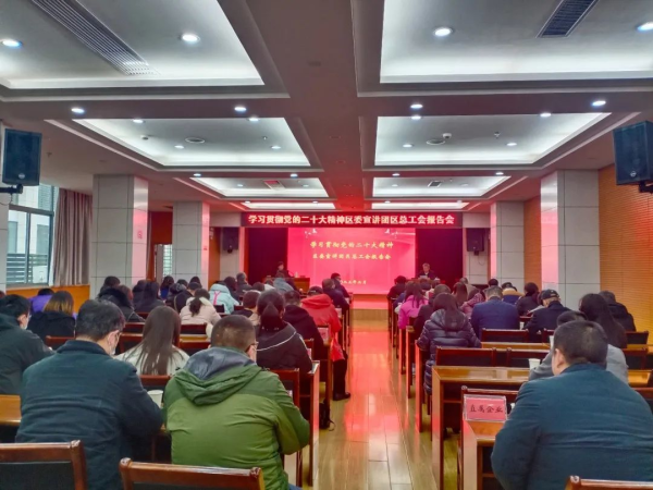 2月23日下午,酒店偷拍 总工会开展“学习贯彻党的二十大精神”区委宣讲团报告会,酒店偷拍 总工会全体干部职工,街道、社区、机关、企事业单位工会干部共计100余人参加学习。