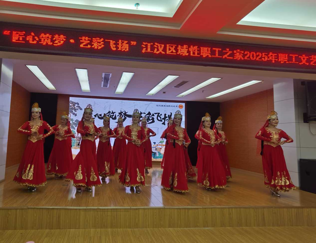 参观完书画摄影展后,职工们来到区总工会二楼会议室,这里座无虚席,由职工兴趣团队担纲的文艺汇演在双重喜庆氛围中拉开帷幕。9支团队来自职工舞蹈、合唱、非洲鼓等兴趣班,队员们将课堂所学与日常排练结合,从民族风情到活力动感,从优雅走秀到激情鼓点,每一个节目都是职工课堂“教学-实践”的鲜活成果,也蕴藏着对祖国、对工运事业的真挚情感。