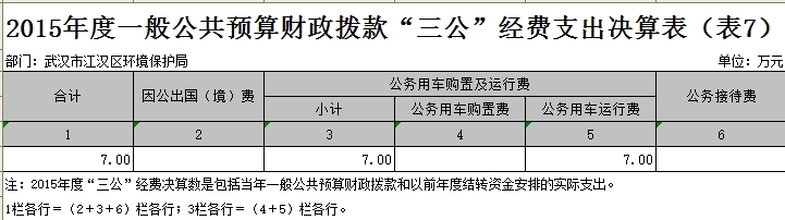 2015年度“三公”经费财政拨款年度预算数为13.93万元,支出决算为7万元,比预算减少7.43万元,公务用车费比预算减少2.5万元,公务接待费比预算减少4.93万元,其中: