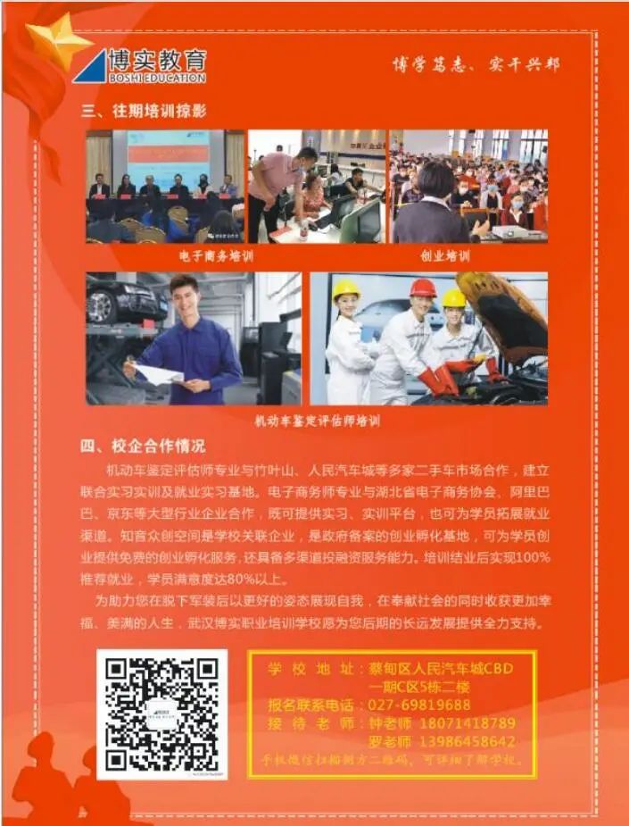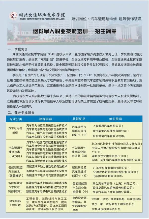 为做好退役军人职业技能培训工作,武汉市退役军人事务局今年考核并确定了全市45家职业教育和技能培训机构,面向退役军人开展免费职业教育和技能培训,退役军人可根据自身需求从中选择承训机构和所学专业接受培训。