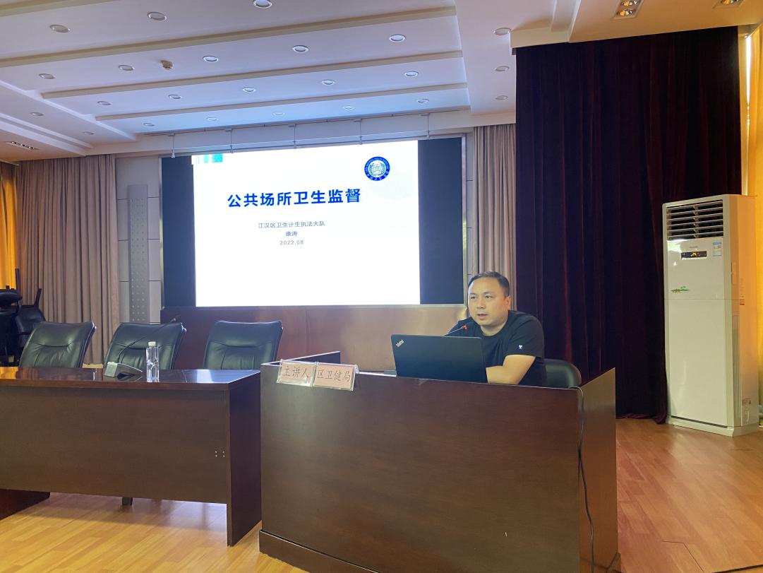 卫生健康领域赋权事项8项,卫计执法大队副队长康涛围绕公共卫生场所的监管依据、监管范围和监督原则开展授课。