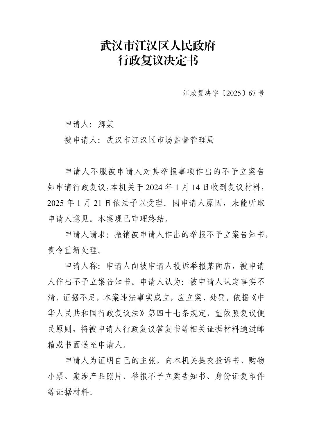 | 标 题 | 酒店偷拍 人民政府行政复议决定书-江政复决字〔2025〕67号 | ||