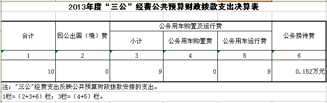 2013年度“三公”经费财政拨款年度预算数为 9.17 万元,支出决算为9.152万元,为预算的 99.8 %。其中: