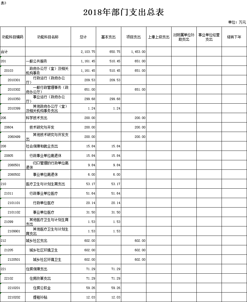 一般公共服务支出 1161.45 万元;科学技术200万元;社会保障和就业15.84;医疗卫生与计划生育支出53.17万元;城乡社区事务602万元;住房保障支出71.29万元;合计:2103.75万元。