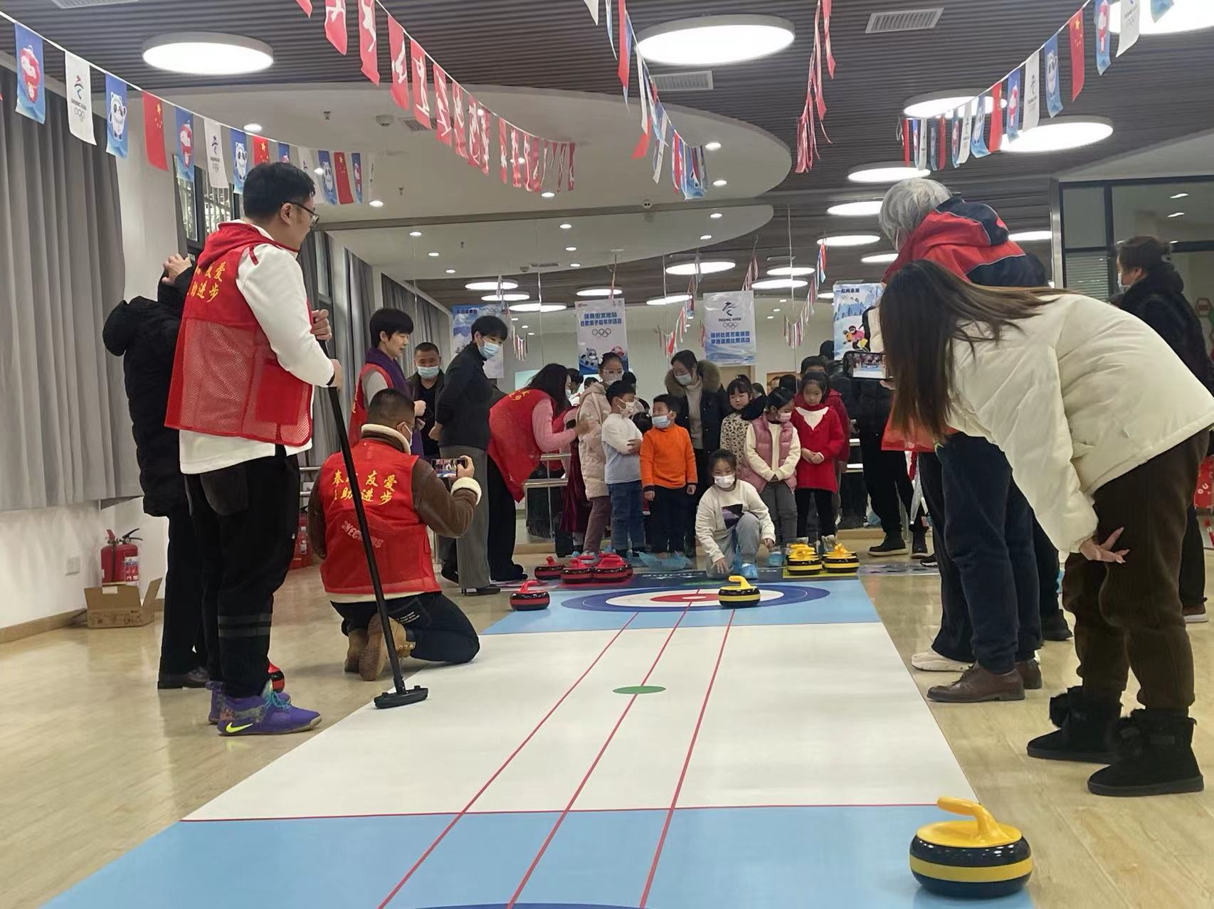 最近的人气顶流,冬奥吉祥物冰墩墩憨态可掬,由冬奥吉祥物、冬奥项目彩旗装饰的大厅、10米长的冰壶场地,一下把节日氛围拉到满格。家长和孩子们席地而坐,制作元宵灯笼,看冬奥精彩视频,学习冬奥会小知识,有关冬奥会的知识问答,把活动带入第一个高潮,小朋友们都非常积极的要求回答问题,甚至来不及举手就高呼出答案了!活动的高潮出现在亲子冰壶体验。武汉,一个南方滨江城市,大家普遍对冰上运动比较陌生,难得的旱地冰壶体验让家长和孩子都充满新奇感,认真听规则,积极推动手里的冰壶找感觉,调整姿态、大手扶着小手,每组家庭都沉浸在冰壶运动的快乐中。