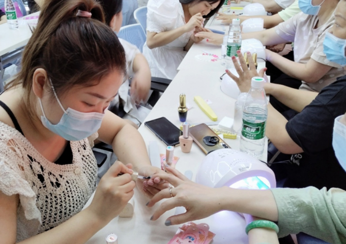 美甲艺术显于色彩,甲型怎么修剪?做什么样的花型?如何呈现完美效果?老师逐一进行教学讲解。在掌握甲型结构、修甲和美甲的操作流程后,每两人一组配备一台光疗机进行艺术美甲操练,老师手把手进行指导纠正,直到完全实操做好为止。