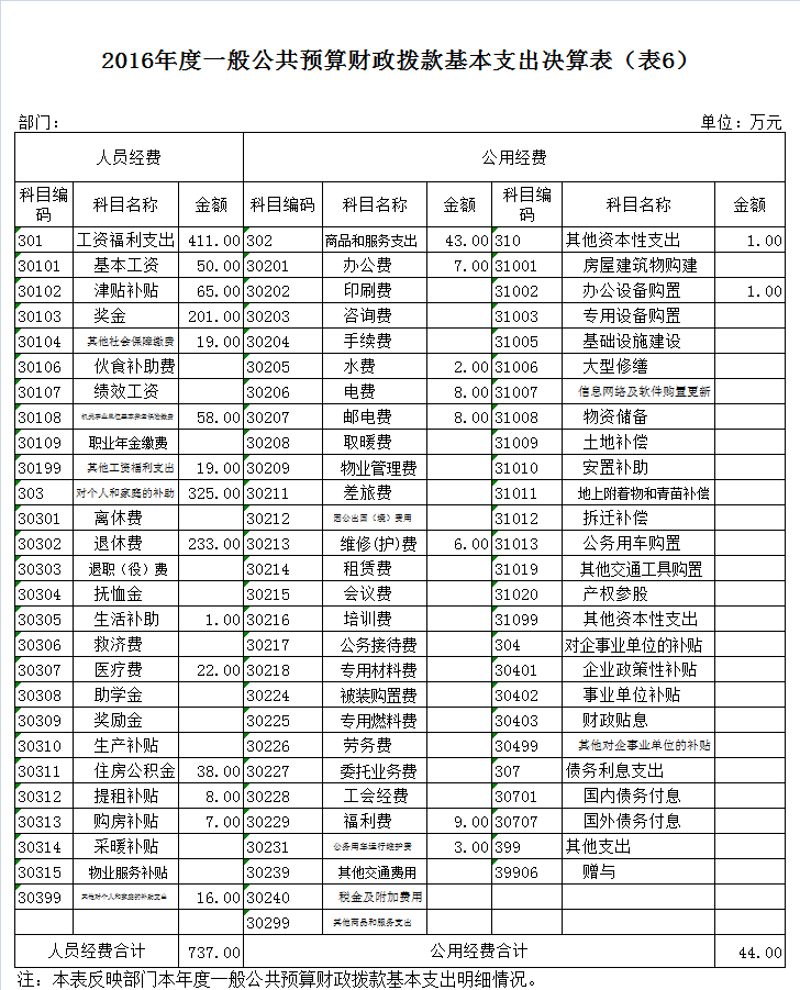 2016年度一般公共预算财政拨款基本支出 781 万元,其中,人员经费737万元,主要包括:基本工资、津贴补贴、奖金、社会保障缴费、绩效工资、其他工资福利支出、离休费、退休费、抚恤金、退职(役)费、抚恤金、生活补助、救济费、医疗费、助学金、奖励金、生产补贴、住房公积金、提租补贴、购房补贴、其他对个人和家庭的补助支出;公用经费 43万元,主要包括:办公费、印刷费、咨询费、手续费、水费、电费、邮电费、取暖费、物业管理费、差旅费、因公出国(境)费、维修(护)费、租赁费、会议费、培训费、公务接待费、专用材料费、被装购置费、专用燃料费、劳务费、委托业务费、工会经费、福利费、公务用车运行维护费、其他交通费用、税金及附加费用、其他商品和服务支出;其他资本性支出 1 万元,主要包括:房屋建筑构建费、办公设备购置、专用设备购置、基础设施建设、大型修缮、信息网络及软件购置更新、物资储备、土地补偿、安置补助、地上附着物和青苗补助、拆迁补偿、公务用车购置、其他交通工具购置、其他基本建设和资本性支出。