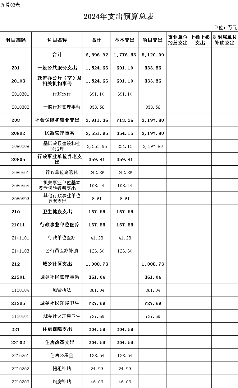 2024年财政拨款收支总预算4296.92万元。收入包括:一般公共预算拨款本年收入4296.92万元。支出包括:一般公共服务支出1524.66万元;社会保障和就业支出1311.36万元;卫生健康支出167.58万元;城乡社区支出1088.73万元;住房保障支出204.59万元。