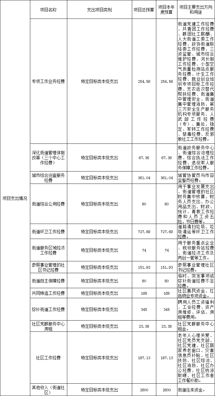 1.专项工作业务经费254.56万元,主要用于街道党建工作经费、共青团工作经费、群团社工聘用人员工资、人大街道工委工作经费、政协街道联络委工作经费、三资监管、城市综合维护经费、河长制工作经费、小型空气质量检测站点服务经费、计生工作经费、就业创业培训专项目标工作经费、支农返汉替代帮扶经费、街道集中管理安全、街道集中管理消防、第三方安全生产服务机构专项服务、人武部工作经费、集处稳定军转工作经费、禁毒经费、反邪教社工工作经费等。