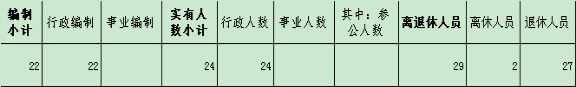 前进街办事处共有编制22人,其中:行政编制22人。在职实有人数24人,其中:行政24人。离退休人员29人,其中:离休2人,退休27人。