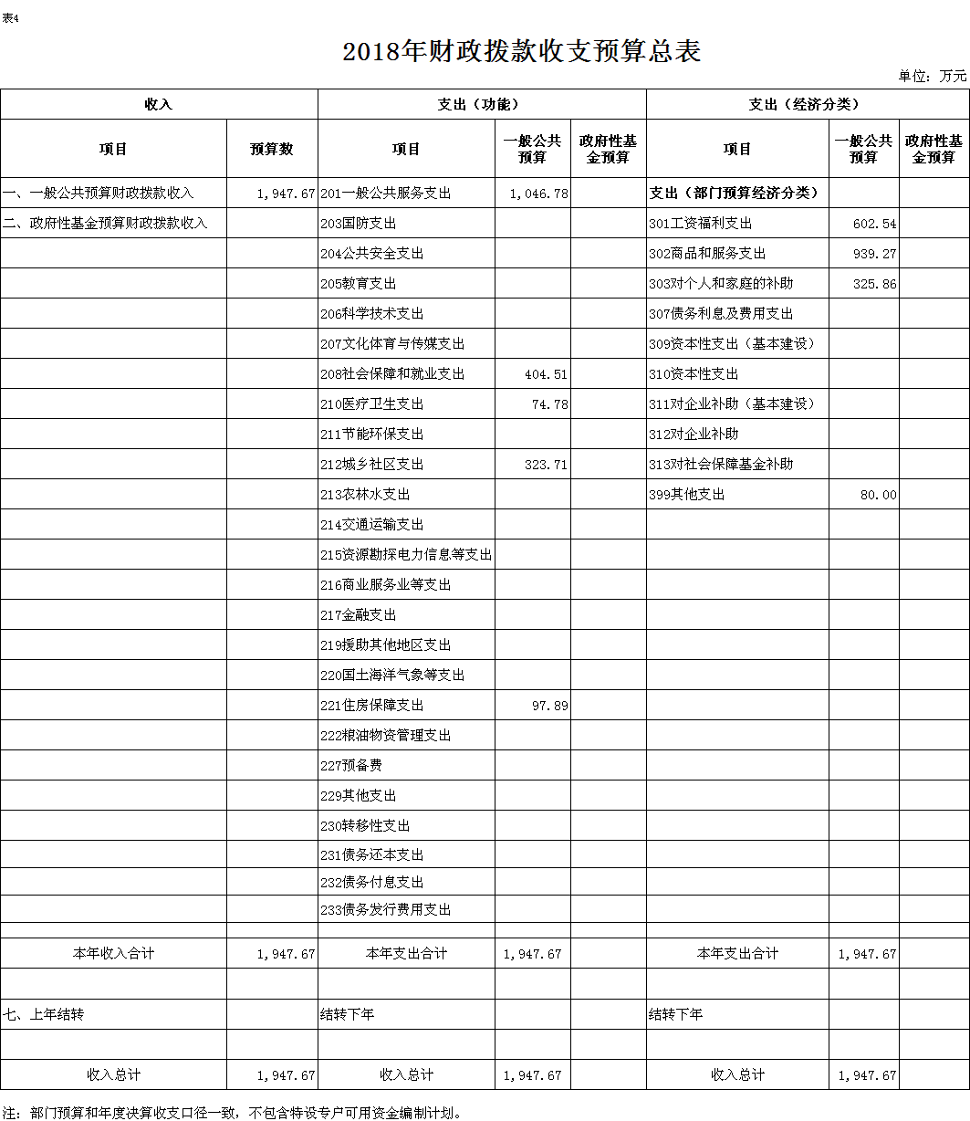 2018年一般公共预算财政拨款(补助)预算数1947.67万元,安排情况如下: