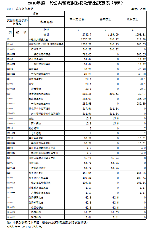 2016年一般公共预算财政拨款支出年度预算为 2785.7 万元(包括年初部门预算、基本建设等专项资金、上级下达的专项转移支付资金及年初结转和结余资金等支出),支出决算为 2785.7 万元,完成年度预算的 100 %。其中:基本支出 1189.09 万元,项目支出 1596.61 万元。项目支出主要用于一般公共服务支出817.76万元,主要成效用于人员服务区域经济工作经费、集处稳定军转工作经费、街道及社区党员经费、弥补街道工作经费等;民政管理事务285.99万元,主要成效用于城市管理、街道社区工作经费、统计工作经费等。