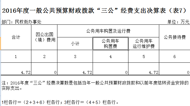 2016年度"三公"经费财政拨款年度预算为 9 万元,支出决算为 4.72万元,完成预算的 52 %。其中: