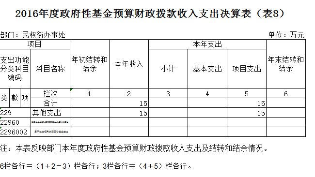 2016年政府性基金预算财政拨款上年结转和结余 0万元,本年收入 15万元,本年支出 15 万元,年末结转和结余 0 万元。