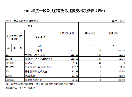 2016年一般公共预算财政拨款支出年度预算为242.46万元(包括年初部门预算、基本建设等专项资金、上级下达的专项转移支付资金及年初结转和结余资金等支出),支出决算为203.04 万元,完成年度预算的83.74%。其中:基本支出1.45万元,项目支出201.59万元。项目支出主要用于聘用人员经费 83.98万元,主要用于支付4月和9月招聘的两批购岗人员工资、社保、公积金和管理费;追加部门预算指标117.60万元,主要成效是举办互联网专项排查培训会、单位办公设备购置等开办费、65户重点企业审计排查和4家重大风险企业尽职调查等。(一般公共预算财政拨款支出决算具体情况,按支出功能分类类级科目逐类分析)