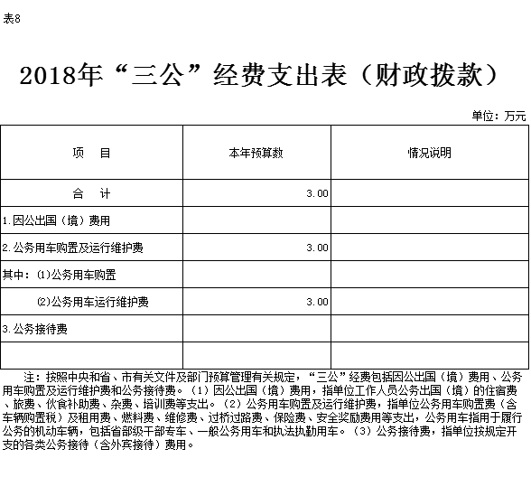2018年部门财政拨款资金安排“三公”经费预算3万元。具体情况如下: