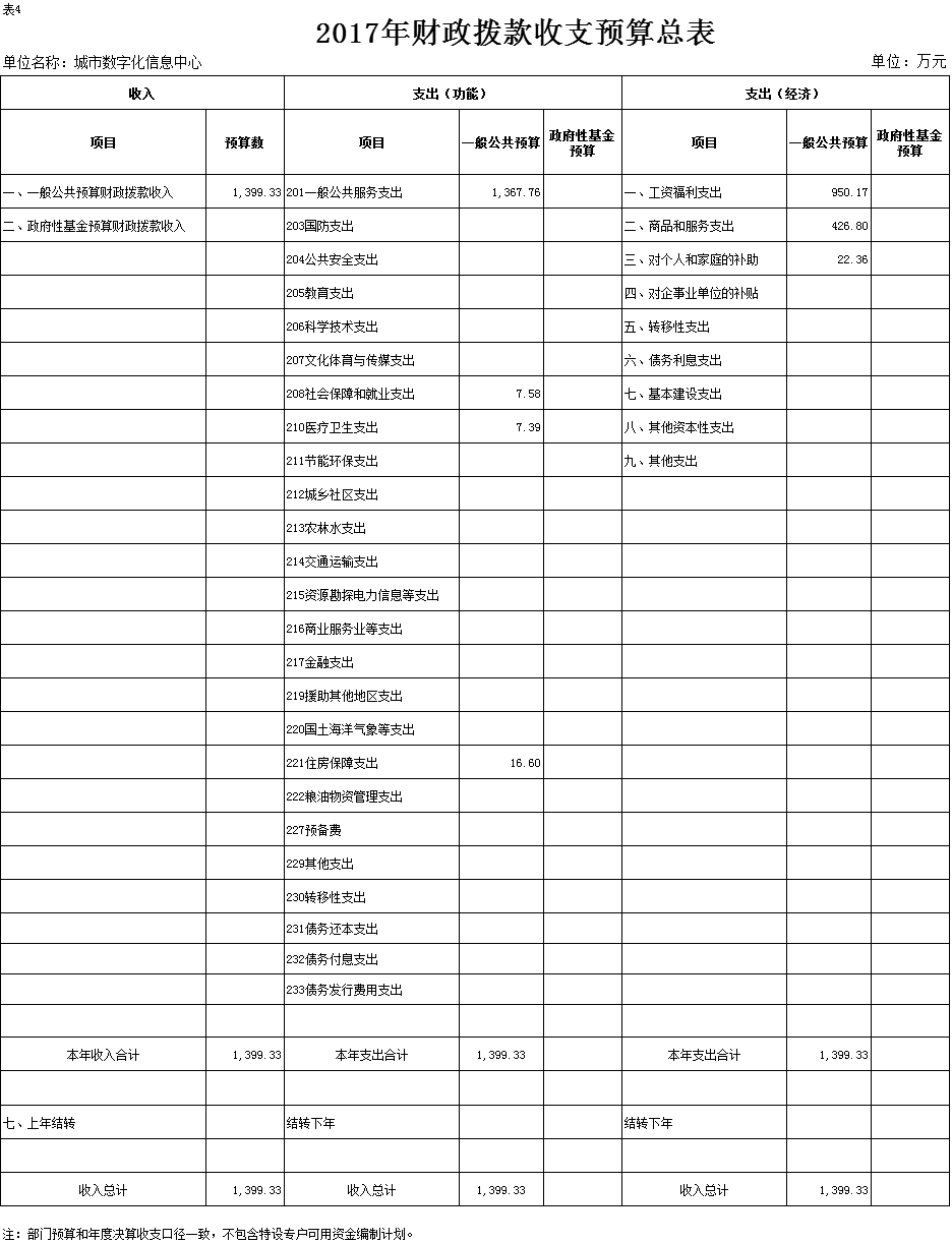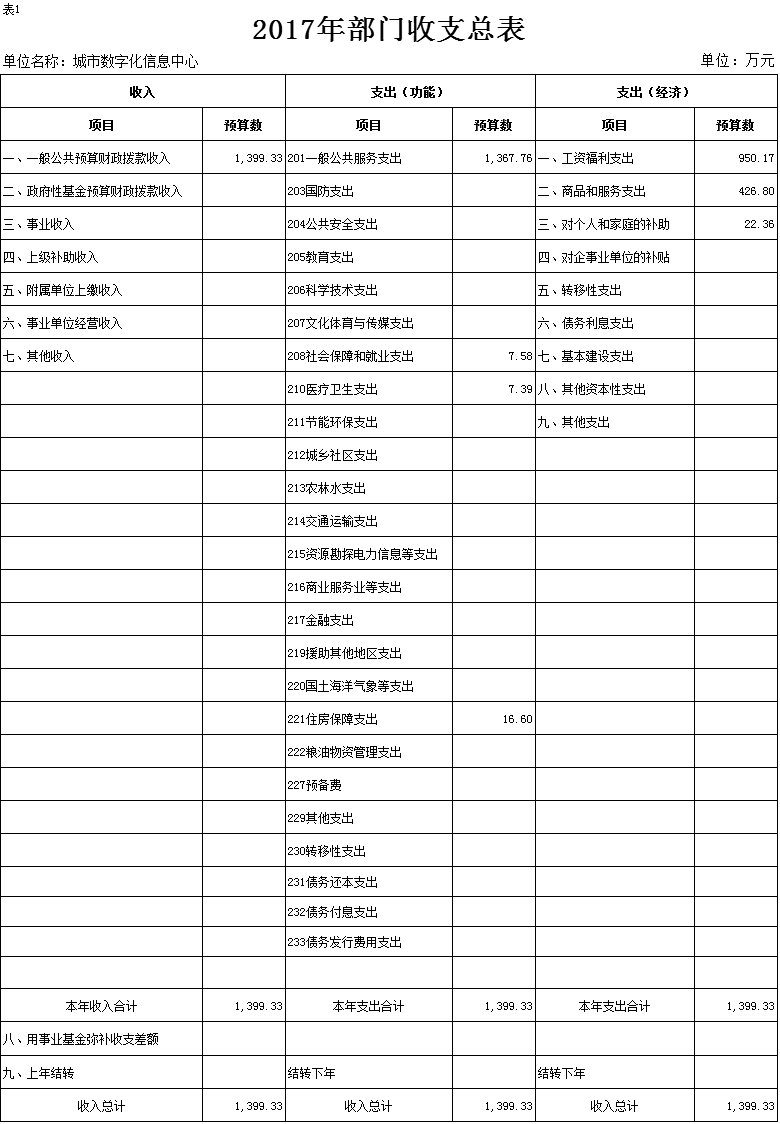 2017年财政拨款(补助)预算数1,399.33万元,安排情况如下: