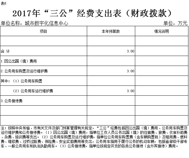 2017年部门财政拨款资金安排“三公”经费预算为3万元。其中: