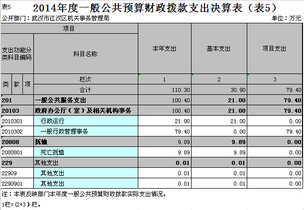 机关运行经费支出。反映行政单位和参照公务员法管理事业单位履行一般行政管理职能、维持机关日常运转所必须的,用公共预算财政拨款开支的费用。包括单位基本支出和一般行政管理项目支出。其中:基本支出包括人员经费和公用经费两个部分。人员经费具体包括工资、津贴及奖金、医疗费、住房补贴等(不包括离退休支出,包括离退休人员管理机构的在职人员支出);公用经费具体包括办公及印刷费、水电费、邮电费、取暖费、交通费、差旅费、会议费、福利费、物业管理费、日常维修费、专用材料费、一般购置费等。一般行政管理项目支出包括出国费、招待费、会议费、办公用房维修租赁、购置费(包括设备、计算机、车辆等)、干部培训费、执法部门办案费、信息网络运行维护费等用于一般行政管理事务方面的项目支出。