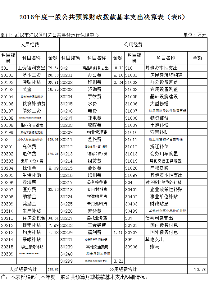 2016年度一般公共预算财政拨款基本支出549.31万元,其中,人员经费538.62万元,主要包括:基本工资、津贴补贴、奖金、社会保障缴费、绩效工资、其他工资福利支出、离休费、退休费、抚恤金、退职(役)费、抚恤金、生活补助、救济费、医疗费、助学金、奖励金、生产补贴、住房公积金、提租补贴、购房补贴、其他对个人和家庭的补助支出;公用经费10.70万元,主要包括:办公费、印刷费、咨询费、手续费、水费、电费、邮电费、取暖费、物业管理费、差旅费、因公出国(境)费、维修(护)费、租赁费、会议费、培训费、公务接待费、专用材料费、被装购置费、专用燃料费、劳务费、委托业务费、工会经费、福利费、公务用车运行维护费、其他交通费用、税金及附加费用、其他商品和服务支出。