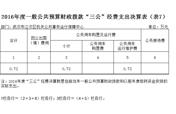 (2)公务用车运行维护费0.72万元,完成预算的16%,主要原因是燃料费降低。其中:租车费0万元;燃料费0万元;维修费0.65万元;过桥过路费0.07万元;保险费0万元;安全奖励费用0万元。
