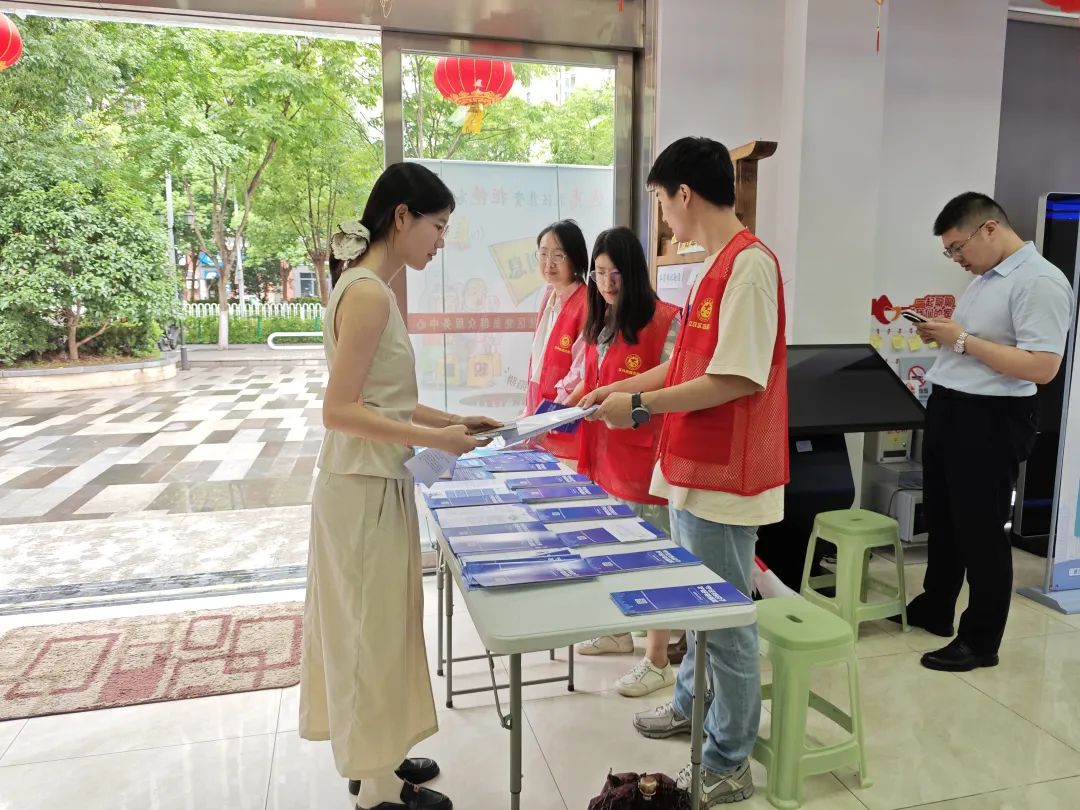 武汉金融街管委会党员志愿者们佩戴党员党徽,热情地向居民发放防范非法集资宣传手册、折页等资料,讲解非法集资的常见形式、惯用手段以及防范要点。