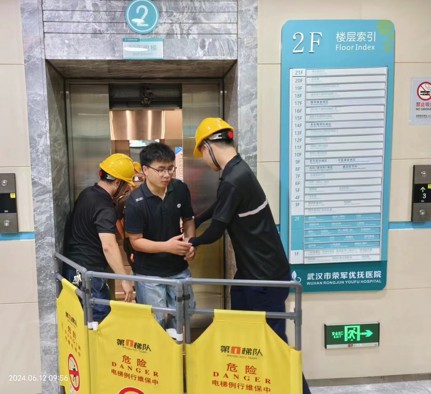 随后湖北芝友机电工程有限公司在荣军优抚医院开展了电梯应急救援演练。电梯安全监察人员、维保单位相关人员、医院管理人员代表参加演练。上午10时整,演练工作按预设的程序展开,现场由20多名员工组成的演练救援小组,有条不紊的通过对安抚乘客、现场秩序维护、轿厢急停楼层确定等步骤,不到10分钟,救援小组将被困人员从轿厢内救出。