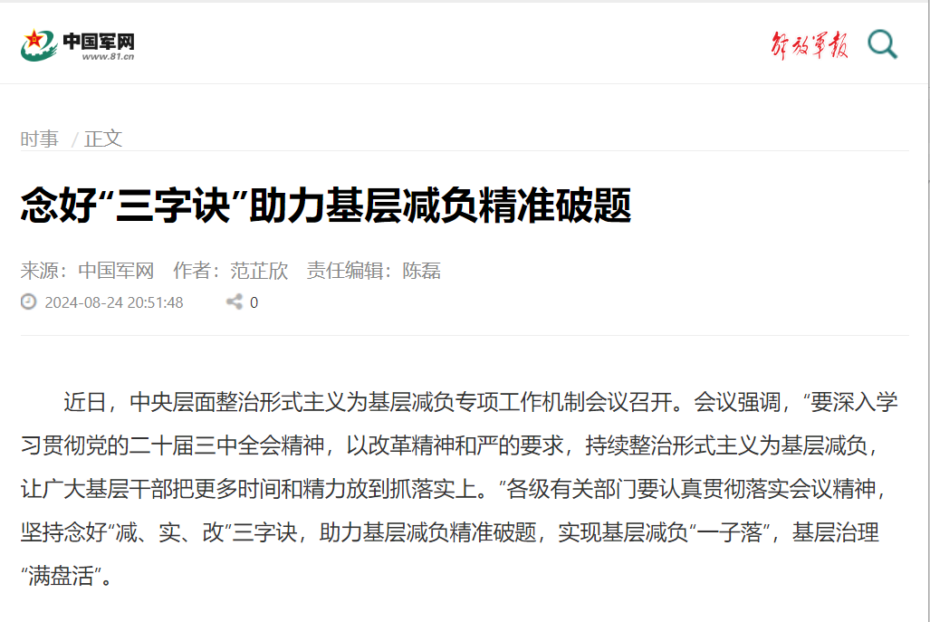 近日,中央层面整治形式主义为基层减负专项工作机制会议召开。会议强调,“要深入学习贯彻党的二十届三中全会精神,以改革精神和严的要求,持续整治形式主义为基层减负,让广大基层干部把更多时间和精力放到抓落实上。”各级有关部门要认真贯彻落实会议精神,坚持念好“减、实、改”三字诀,助力基层减负精准破题,实现基层减负“一子落”,基层治理“满盘活”。