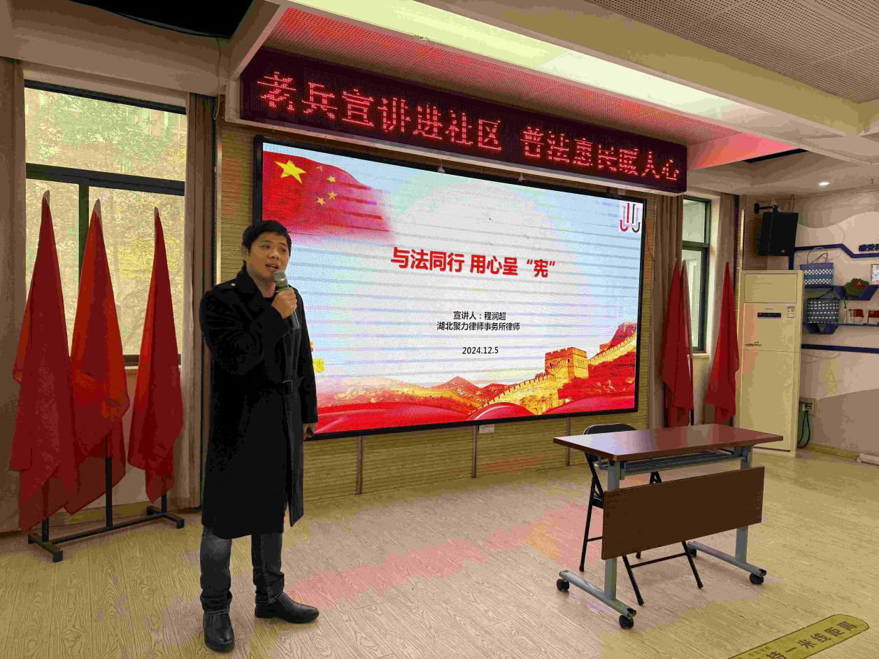 湖北聚力律师事务所负责人兼党支部书记、武汉市退役军人服务中心张富清老兵法律志愿服务团成员程润超律师以生动的语言和深厚的法学功底,对新中国宪法的演变和宪法日的由来进行细致讲解,让原本抽象的宪法条文变得鲜活起来。随后程律师以民法典与宪法的关系为切入点,结合丰富的实践案例开展以案说法,“离婚房产分割一共有多少种情形?”“房产证上加名字就能分走一半财产吗?”……程律师聚焦日常生活常见场景,为大家解读了民法典中婚姻与继承相关法律问题,例如离婚冷静期、婚前财产新规、离婚财产分割等内容,引得大家纷纷举手互动。