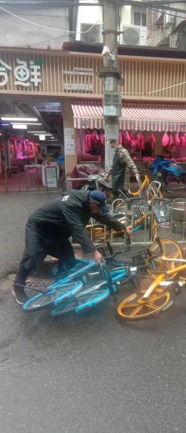 为了解决北湖西路共享单车停放秩序杂乱问题,妙三社区二级路长带领巡查队员将单车摆放整齐。