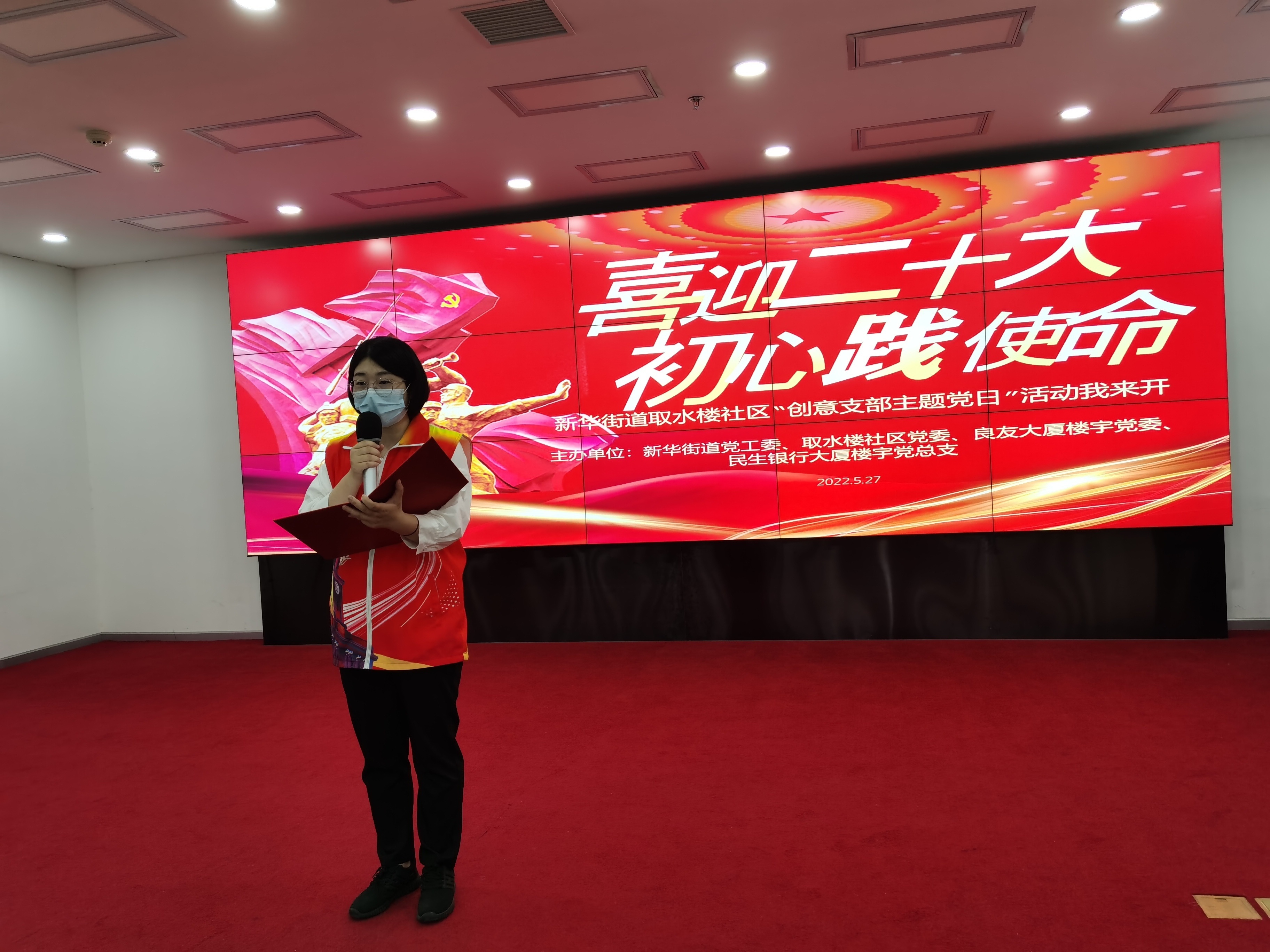 来自新华街道取水楼社区党委及良友大厦楼宇综合党委、民生银行大厦楼宇党总支的青年代表们,以慷慨激昂之声,朗读了建团百年的优选金句,并分享了自己的学习心得,牢记初心使命,坚定理想信念。