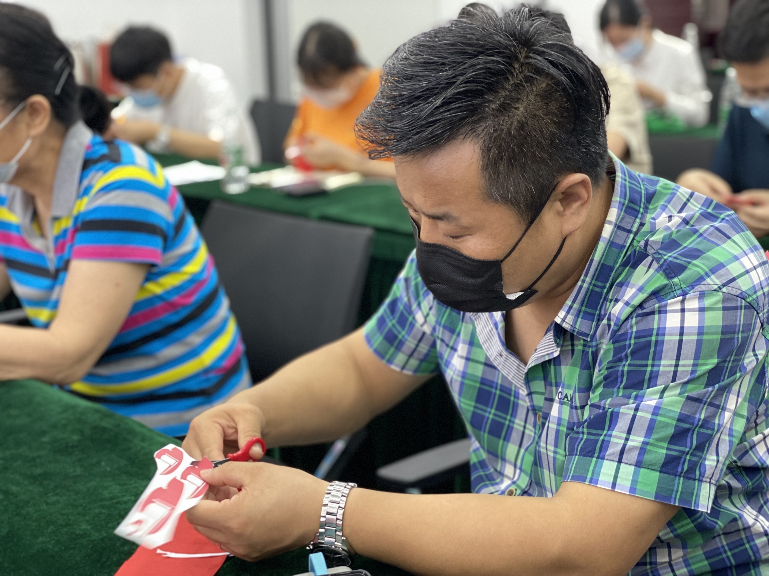 在最后的“剪纸共创红船”环节,听完“红船精神”的概叙后,在社工们的指导下,一只只小红船,通过老青党员代表们灵巧的手,陆续剪出来,大家纷纷走上讲台,将自己精心剪出的红船张贴在旭日当红的主船周围。