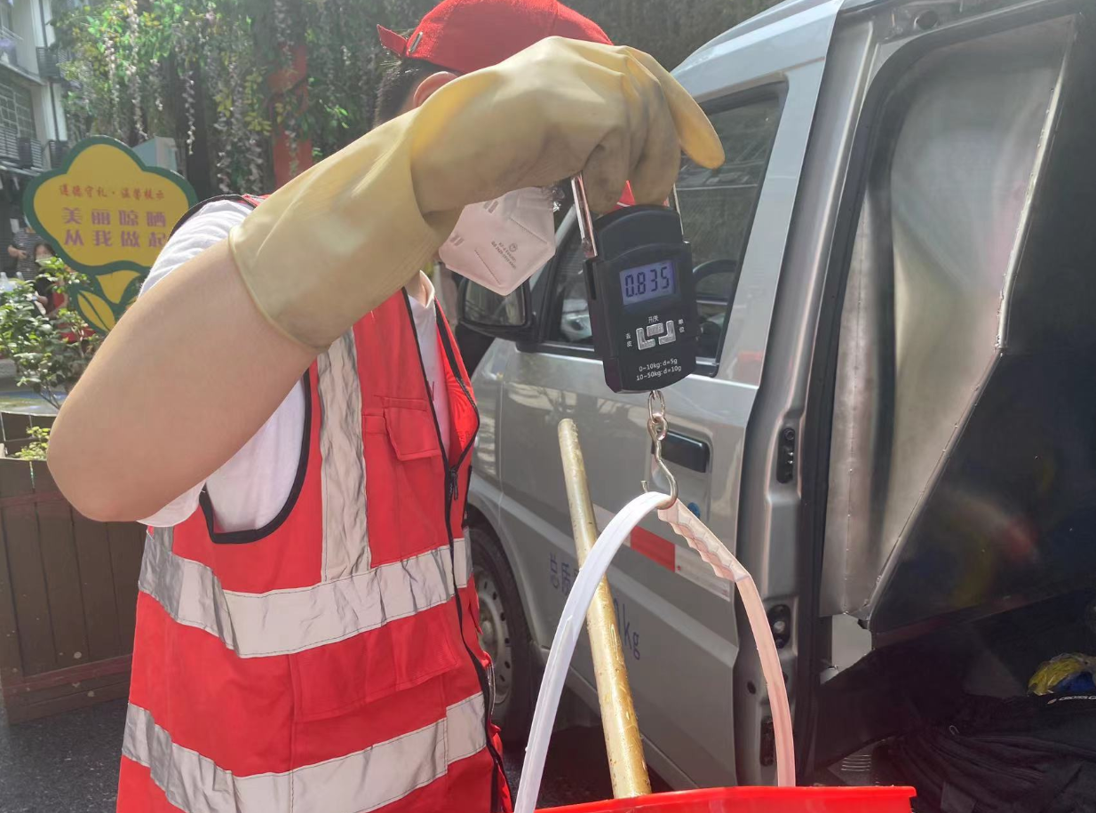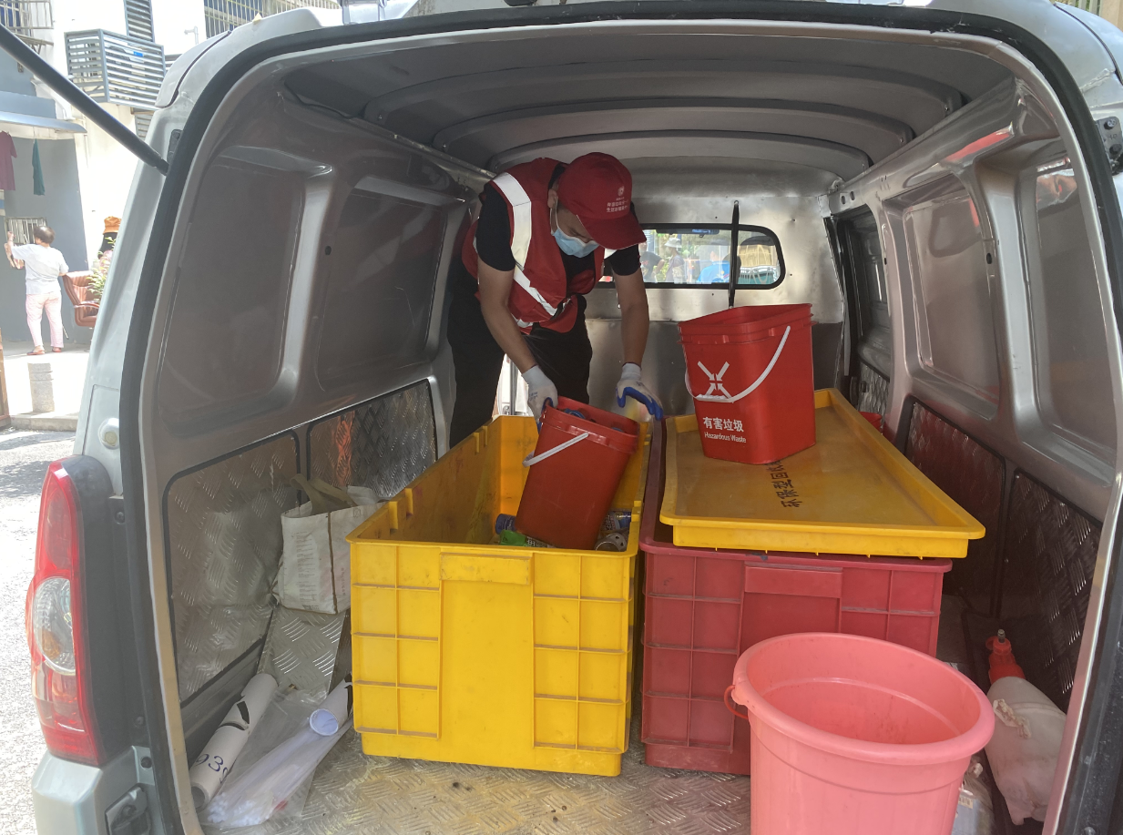 每周一下午三点左右,一辆由面包车改制而成的密闭箱式有害垃圾清运车就会来到武汉市新华街登月小区,工作人员则把居民丢弃的废旧灯管、使用完的杀虫剂喷雾、过期药品、废旧电池等进行回收、称重、装箱和清运。