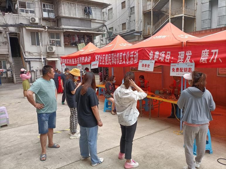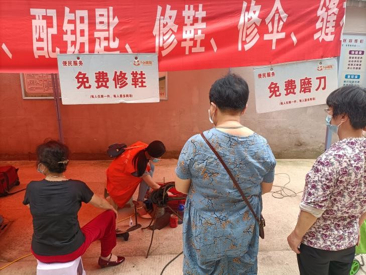 2022年5月30日上午,在新育社区便民驿站门口,新育社区联合1+1亲情小棉袄开展了便民驿站便民服务邻里文化活动,为社区60岁以上的老人提供了磨刀、修鞋、理发、修伞、配钥匙等等免费服务。