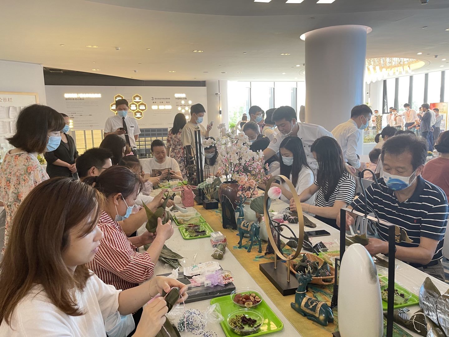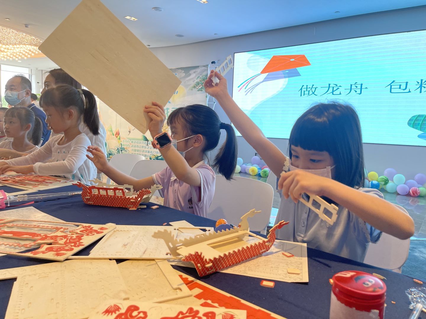 随后,参加活动的家长和儿童在两位专业手工老师指导下制龙舟、包粽子。家长捋粽叶、捏形状,孩子填糯米、放馅料,大家齐心协力、各展所长,专心致志地制作传统佳节美食。