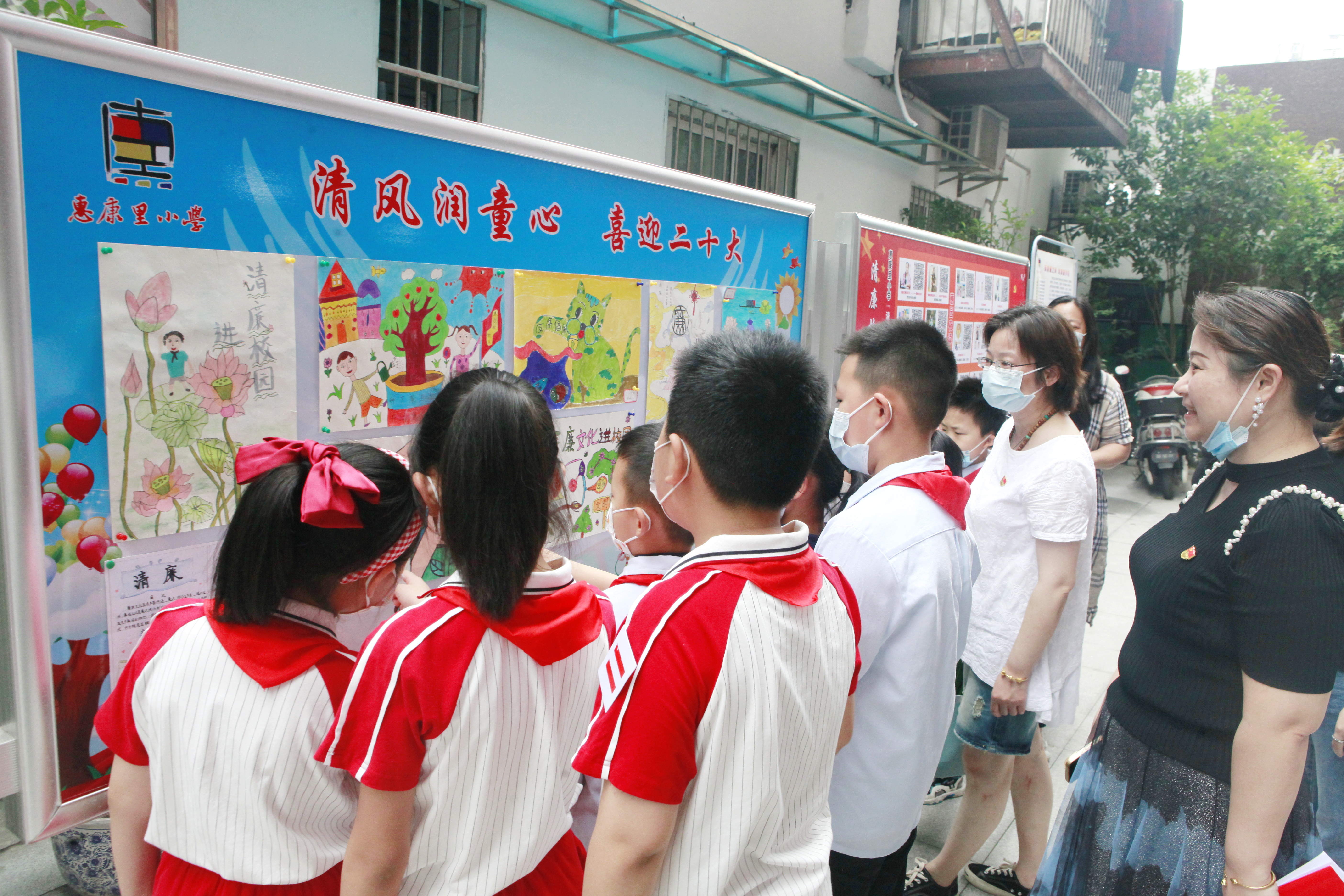 学校的退休老党员熊继平同志现场写下“传承红色基因,培育时代新人”、“立德树人”等书法作品表达了老教育工作者的初心。孩子们与社区老党员一起在环保购物袋上同绘代表着清廉的各式莲花,或卧或立或含苞待放或昂扬向上。翰墨扬正气,廉画传家风,在深浅笔墨中感受润物无声的清廉文化滋养,以“廉”润心,这也是“六一”儿童节孩子们收到的最有意义的礼物。同期,社区党员群众、队员们一起参观了清廉学校建设文化作品展。惠康里小学的姚书记热情地介绍了“清廉故事我来讲”的有声宣传作品、儿童绘画等作品,作品笔触虽然稚嫩,但廉以修身、俭以养德精神内涵深刻融入内里,形成浓郁清廉氛围。