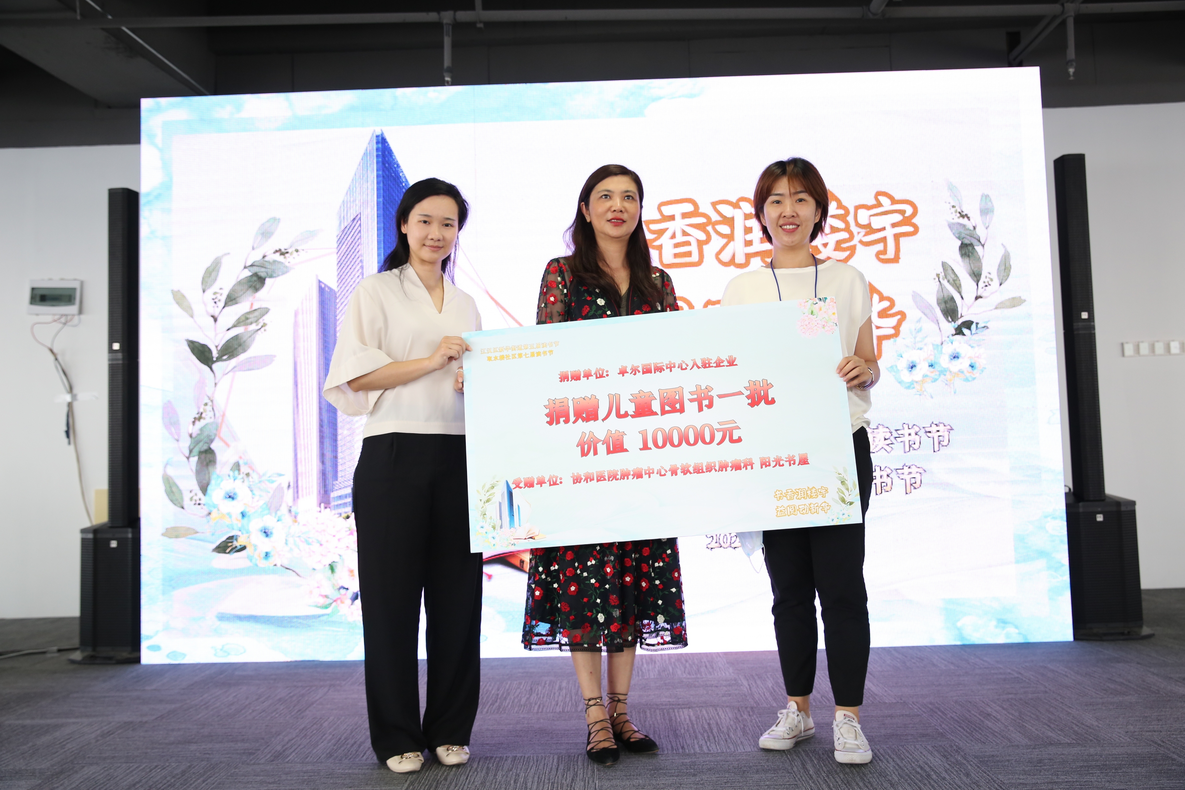 活动主会场,卓尔国际中心总经理周永红代表此次活动的爱心企业机构将“爱心图书捐赠牌”授予协和医院研究生党委副书记欧阳真,希望浩瀚的知识为孩子们开启一扇充满希望的窗,将爱心与祝福通过书籍送到孩子身边。