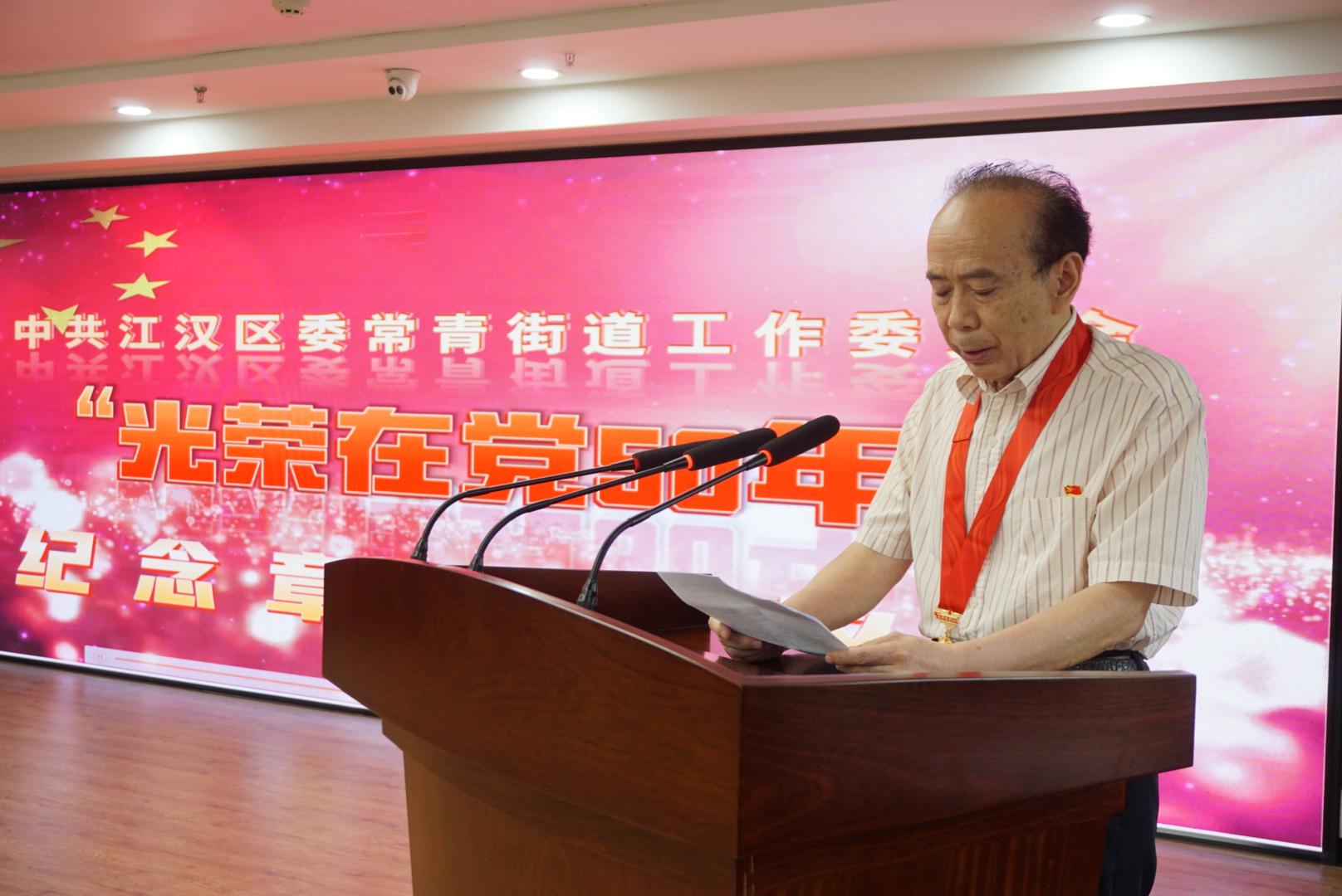 楚天都市金园小区支部党员郭传章在发言中表示,“拿到这枚纪念章,是党对我这一生追随的充分肯定和认可,我将继续发挥余热,尽力多为身边群众做些实事,永葆入党初心不变质。”