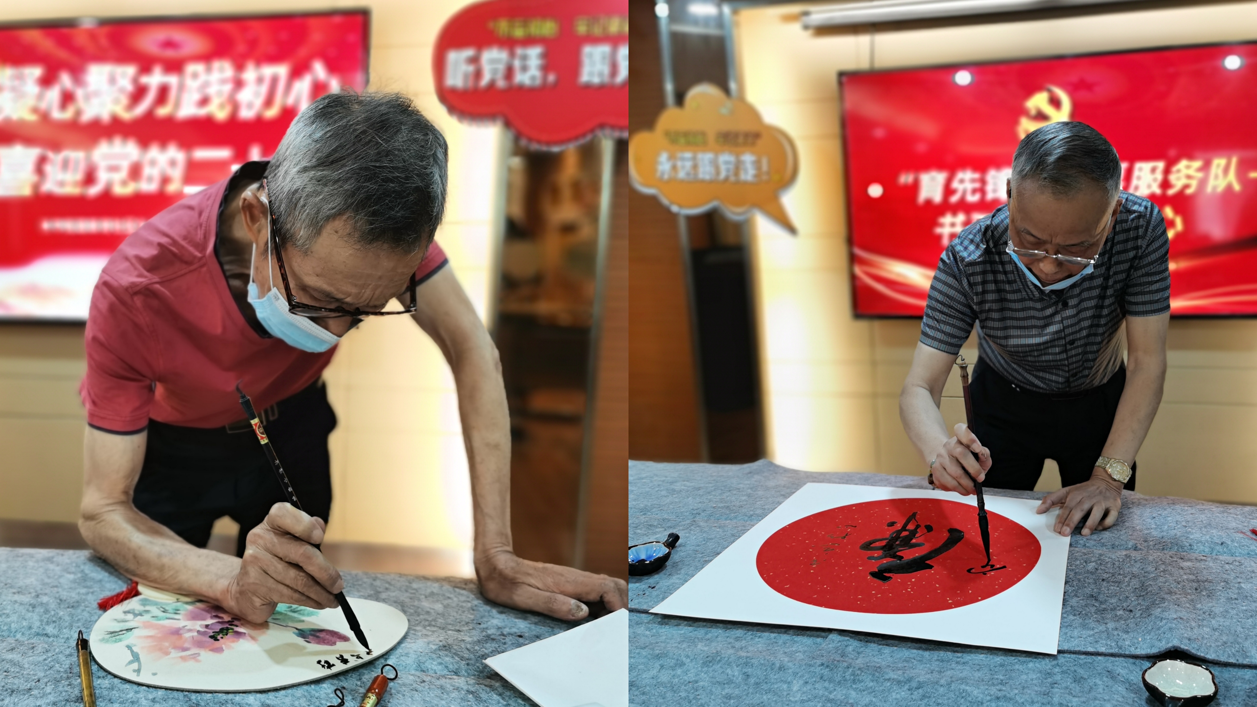 23日上午,新华街道新育社区2楼会议室内,墨香萦绕,两位水墨书画老师正泼墨挥毫即兴创作。他们正是新育社区“育先锋”志愿服务队的老志愿者罗田胜和程世德。只见一笔一划中,一把意境优雅、清新脱俗的莲花便跃然宫扇之上。