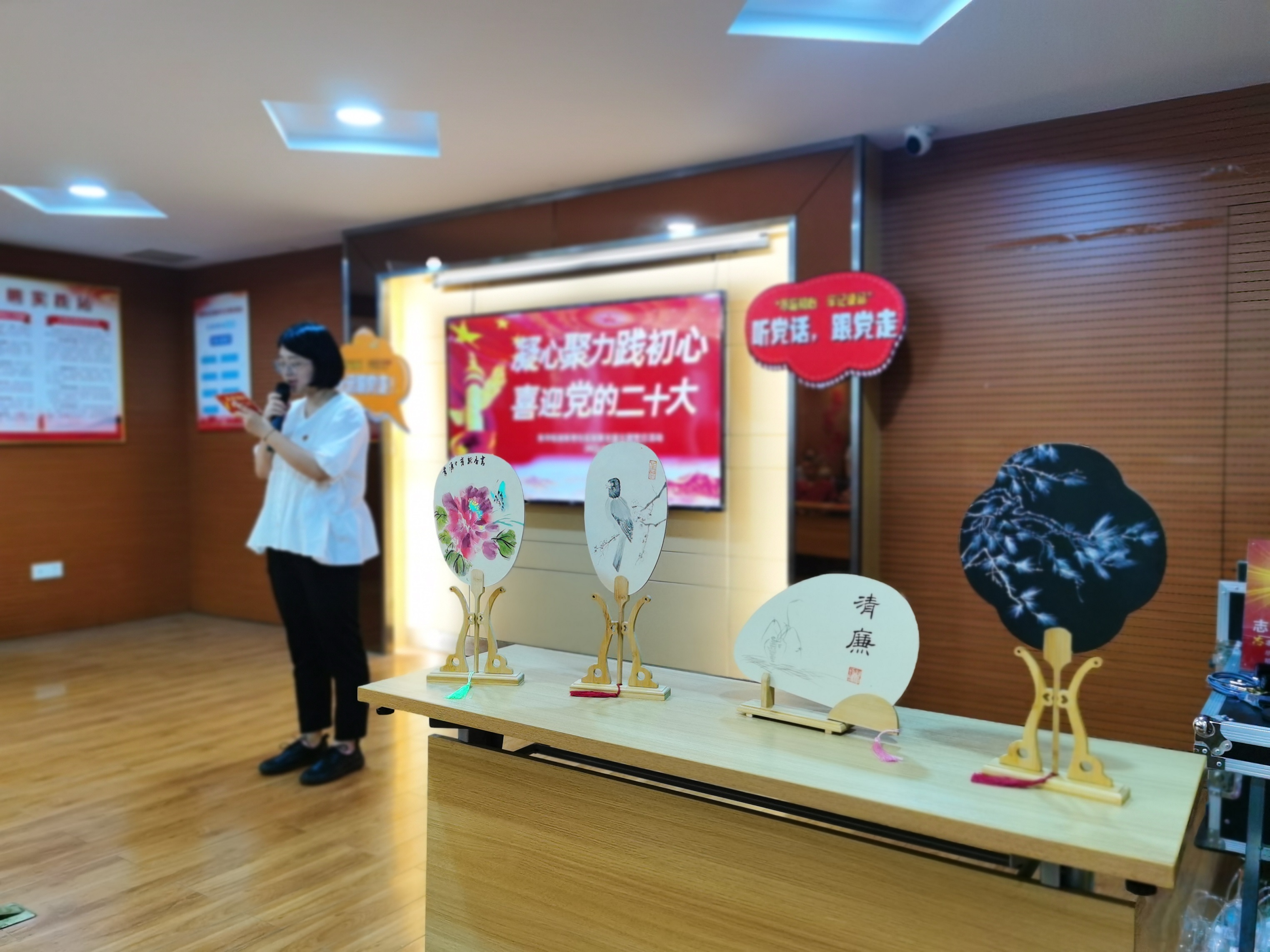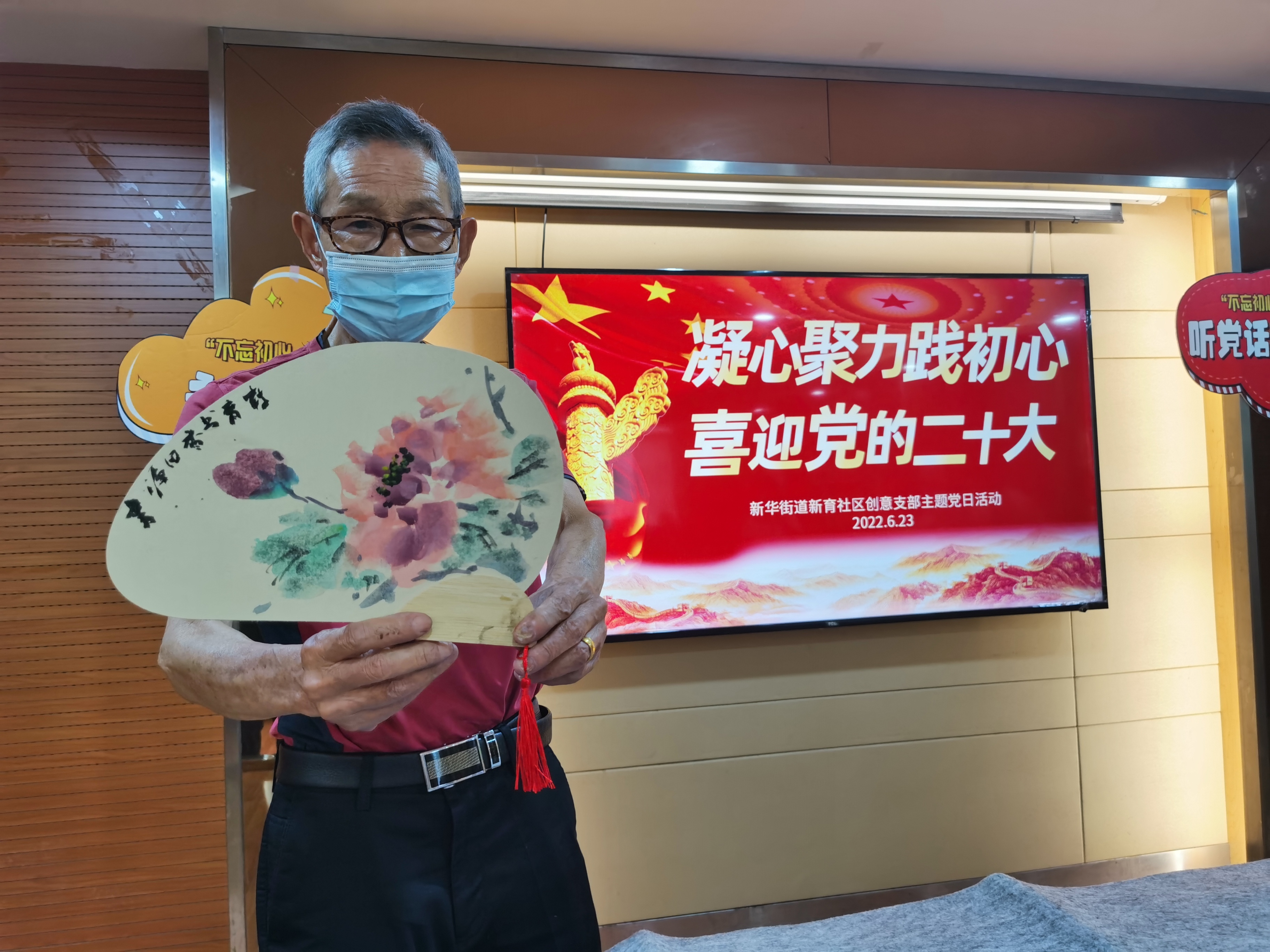 本次活动中,新育社区共建单位辅仁小学方亚祺老师还为社区群众和党员带来了精心创作的以“莲花”“清竹”为主题的工笔画宫扇,收获了现场一片赞叹。