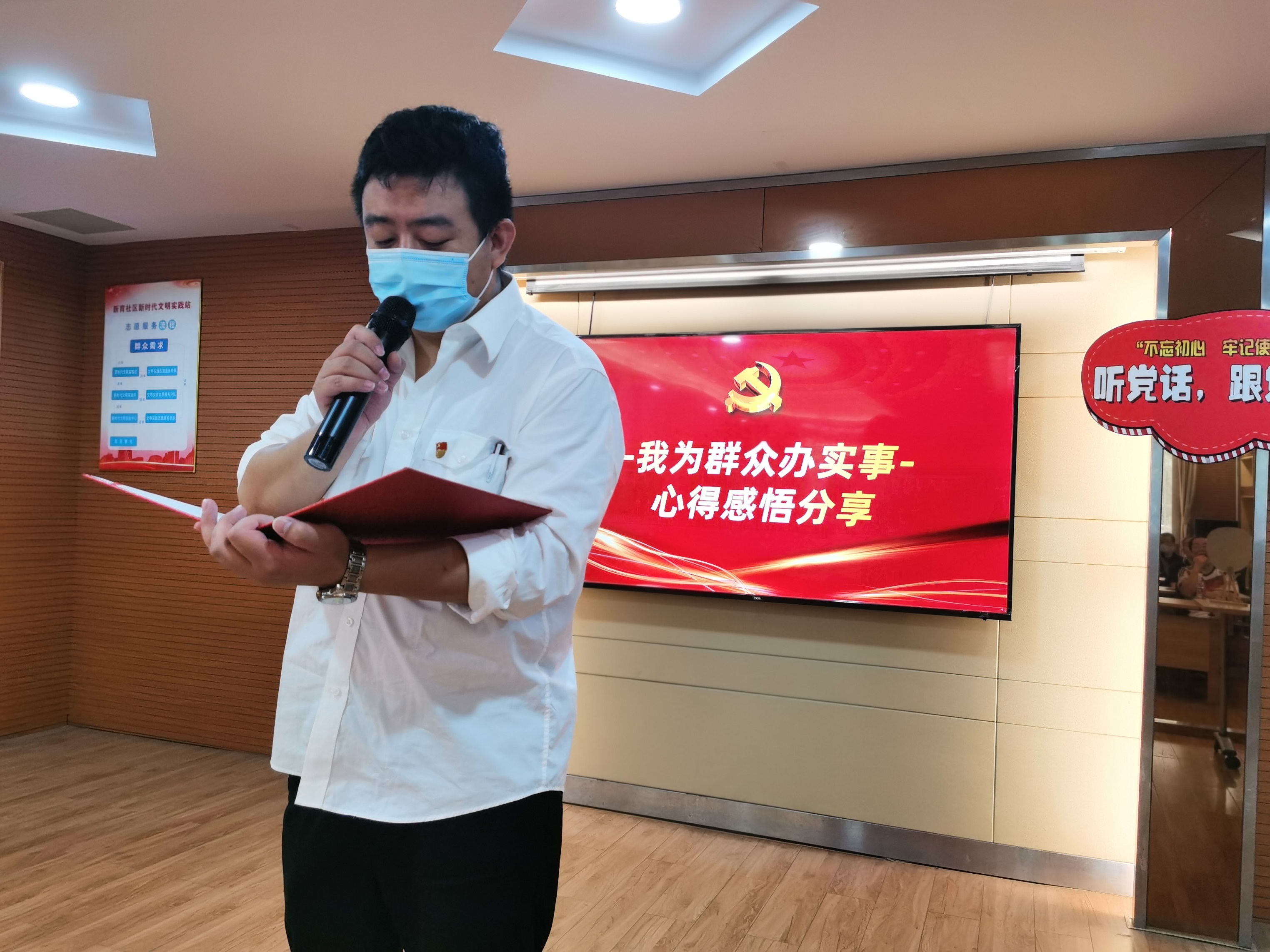 当天的环节中,社区青年党员代表刘忠正、预备党员代表周思荃分享的“我为群众办实事”学习心得感悟,也正是社区建立“我为群众办实事”长效机制,扎实推进党员干部“下基层、察民情、解民忧、暖民心”,也是“一下三民”实践活动的一种创新学习交流形式。