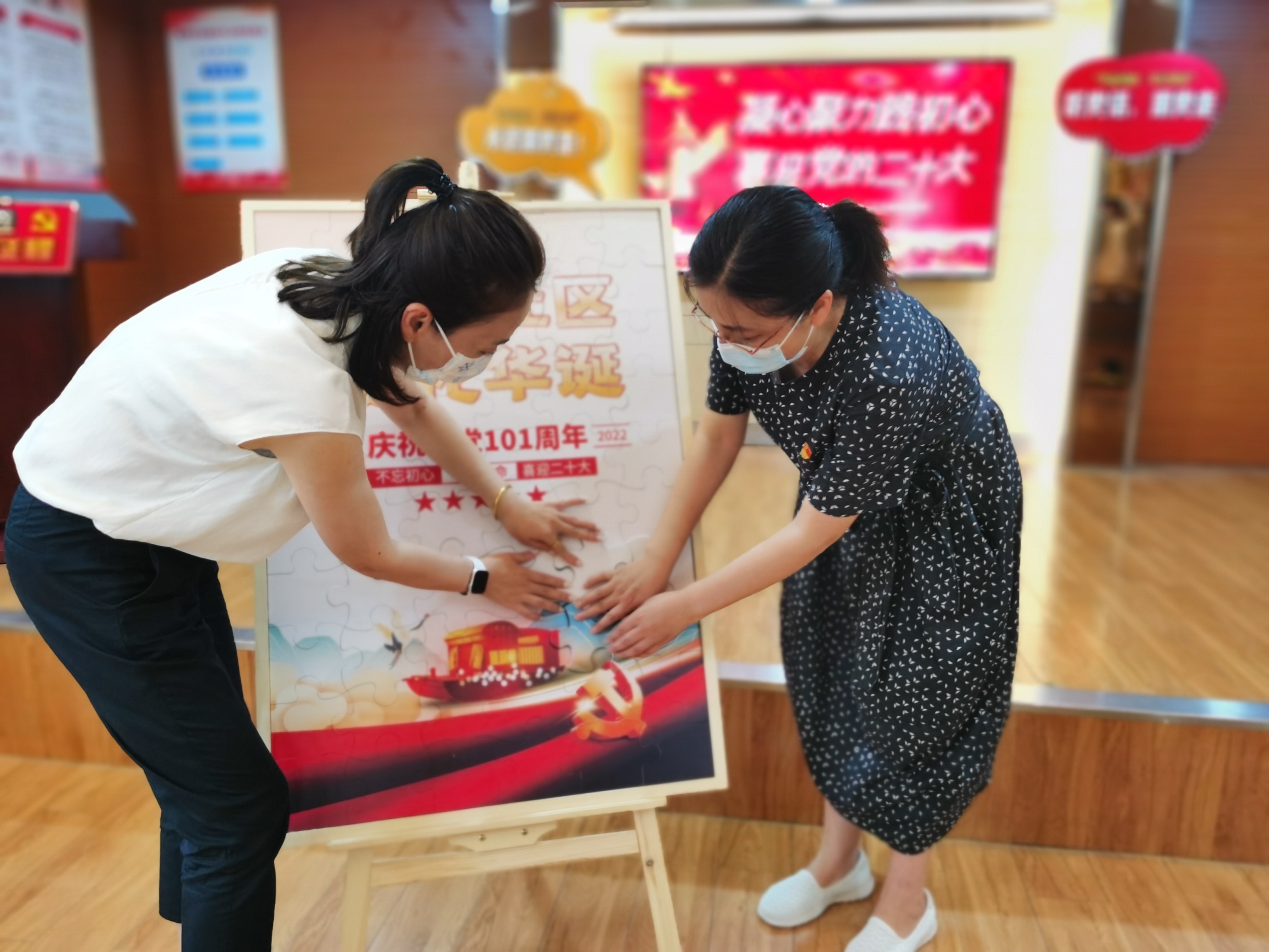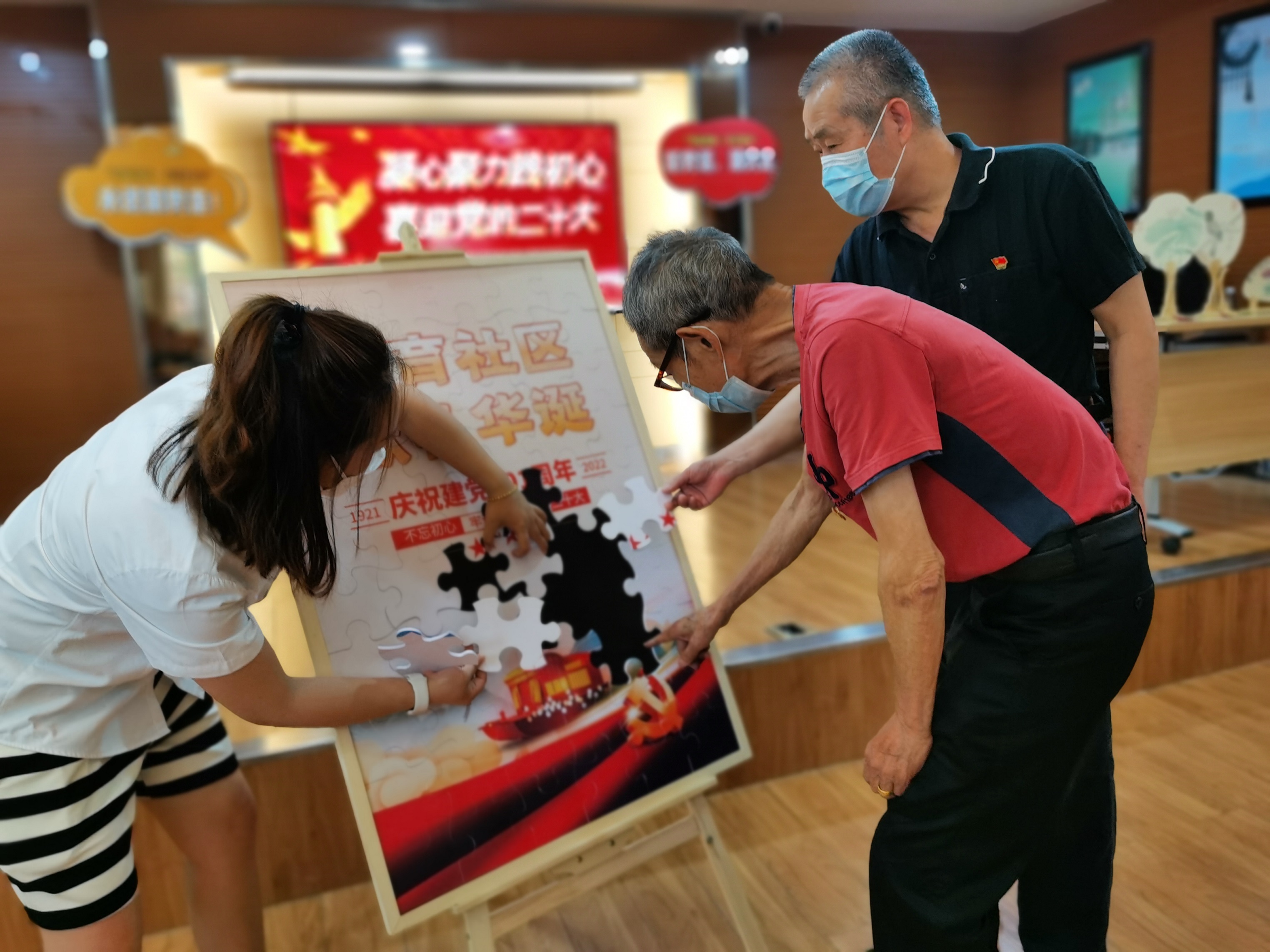 在场老青年党员们以拼图的形式,齐心协力完成了一幅订制“书香新育 献礼华诞”红色主题拼图作品画。”所有党员在完成拼图后,齐聚台前进行合影留恋。