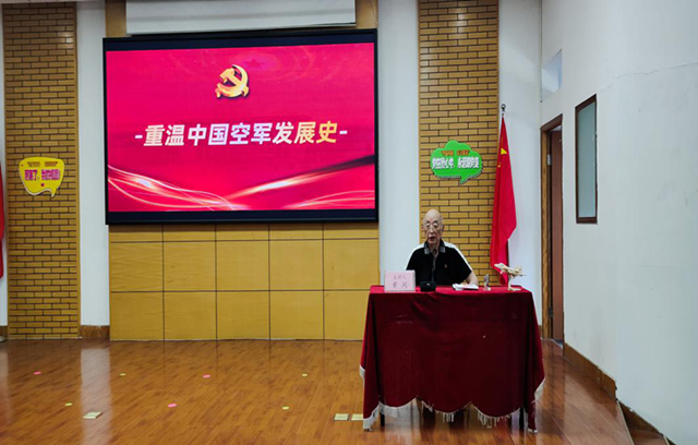 凌云社区90岁高龄的党员黄冈,1950年参军,1954年入党,结合自己在空军部队37年的服役经历,讲述了中国空军从无到有、从小到大、从弱到强百年发展史,勉励党员们从历史中汲取奋进力量,弘扬和传承中国空军砥砺奋进的航空精神。