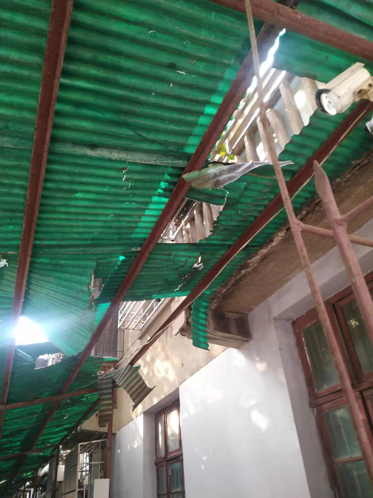 通过前期调查走访了解到,街辖区内新育社区出版社小区车棚顶部材料风吹雨淋破损严重,主体支架部分也已经腐朽脱漆变形,如果遇到大风天气,车棚顶部震动、碎片掉落,将会砸伤来此取车或者经过的居民们。“尤其是到了大风天气,我们都不敢把车停在里面,怕进去就被车棚碎片砸到,但是不放进去,又怕车子被偷了。”刘女士说。到了雨水多的季节,如果雨势较大,还会存在电动车被淋湿发生短路连电的危险,后果不堪设想。