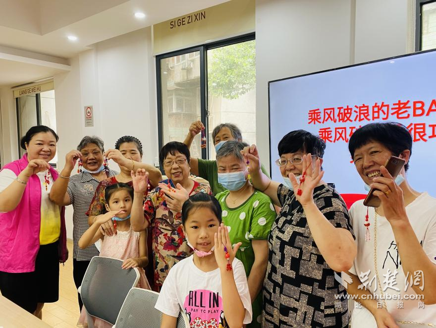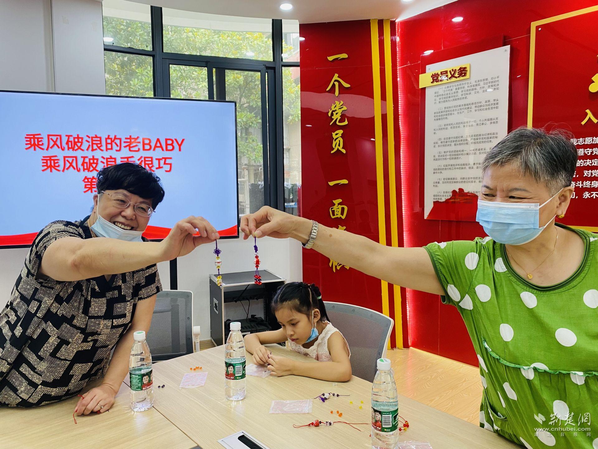 “左线穿一颗珠子,右线穿两颗珠子……”在老师的耐心讲解和手把手指导下,老人们熟练地打着中国结、金刚结、串珠,飞珠走线,自由创作。手工串珠活动看似简单,但其实对于老人们来说却不是一件容易的事,有的老人眼睛看不清了,或者跟不上节奏,现场的小朋友们就帮他们穿珠子、记步骤,就这样互帮互助,大家很快都完成了自己的手工串珠作品。五颜六色的珠串、晶莹剔透的鱼线,在大家的手指间被赋予了生命。