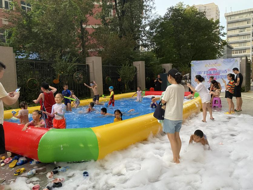 “今年夏天实在是热,孩子们放假在家,小区能否组织一场玩水的活动呢。”在了解到居民的诉求之后,社区积极着手安排部署,统筹辖区共建单位资源,发动群众共同布置活动场地,精心策划了一场“清凉一夏泡泡趴”活动。