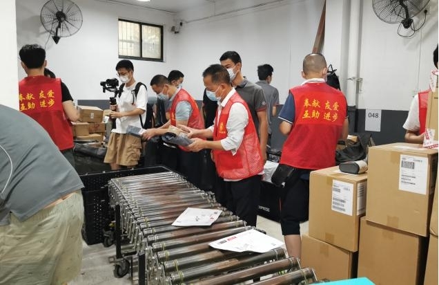 上午7点半,顺丰快递唐家墩营业点一派繁忙景象,快递员正在卸货分拣包裹,参加活动的党员和社区工作者见状快速融入,在了解流程后立刻加入到分拣装车的队伍中。由于天气炎热,分拣装车完毕大家都已经汗流浃背。